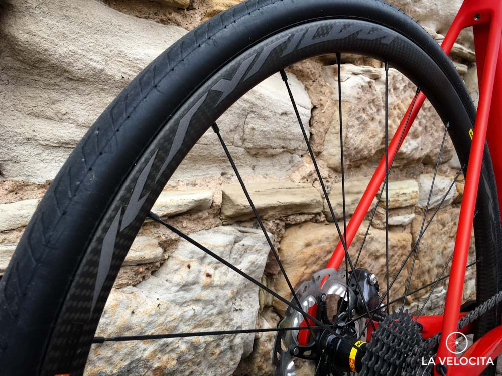 Mavic's Ksyrium Pro Carbon SL disc wheels are held in place by 12mm-thru axles, and slowed by Shimano's excellent hydraulic BR-RS805 flat mount brakes on 160mm rotors.