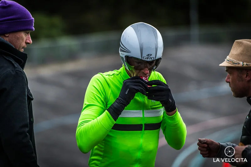 The first cracks came when Drew called out that he felt bloated and started refusing food. He still looked incredibly good and we reminded him to keep a tight line and stay aero. The velodromes surface was rough and the banking inconsistent and was starting to wear him down.