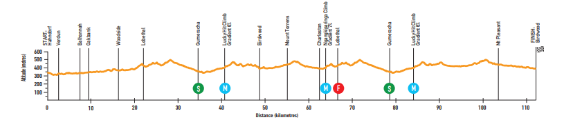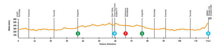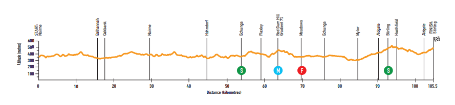 Nairne hosts the race start before doing a loop through the outskirts of Littlehampton, through Balhannah and then Oakbank before going back towards Nairne. Hahndorf will have the race roll through it again but this time the peloton heads south to the first sprint in Echunga. It’s onto Flaxley before the Whites Road QOM and a descent before the flat run back to Echunga and slight drop into Mylor.